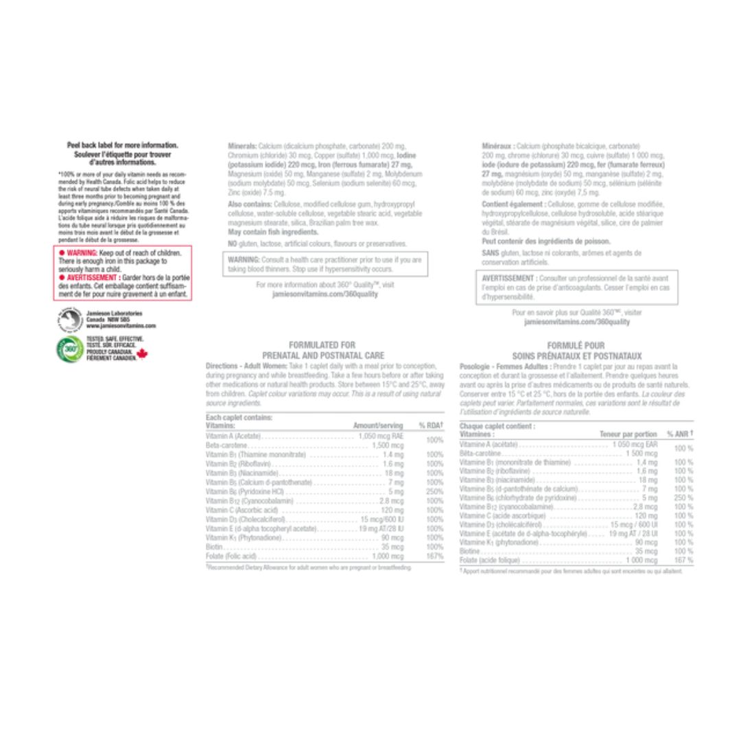 Jamieson 100% COMPLETE Prenatal Multivitamin je kompletni prenatalni i postnatalni multivitamin koji daje 100% i više vitamina i minerala koji se preporučuju trudnicama u samo jednoj tableti dnevno! Bogat je folnom kiselinom koja pomaže u sprječavanju oštećenja neuralne cijevi i osigurava da trudnice i dojilje dobivaju esencijalne vitamine koji su im potrebni za cjelokupno zdravlje njihove bebe.